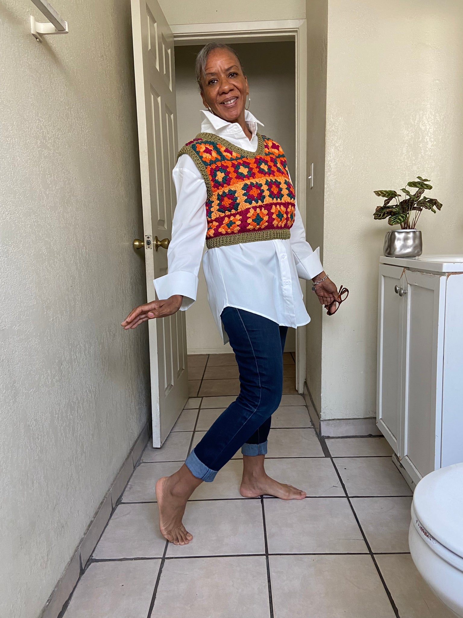 Wrap yourself in nostalgic charm with this hand Crafted Granny Square V-neck sweater vest. It blends classic vintage squares with a modern, flattering silhouette.